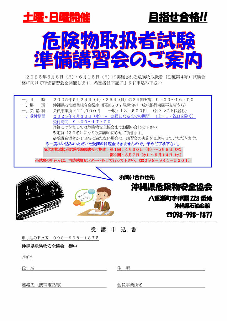 2025年5月 危険物取扱者試験準備講習会のお知らせ 2025年4月13日 沖縄県危険物安全協会より 危険物取扱者試験準備講習会のお知らせ 下の画像をクリックで、PDF開きますので印刷して使用ください。
